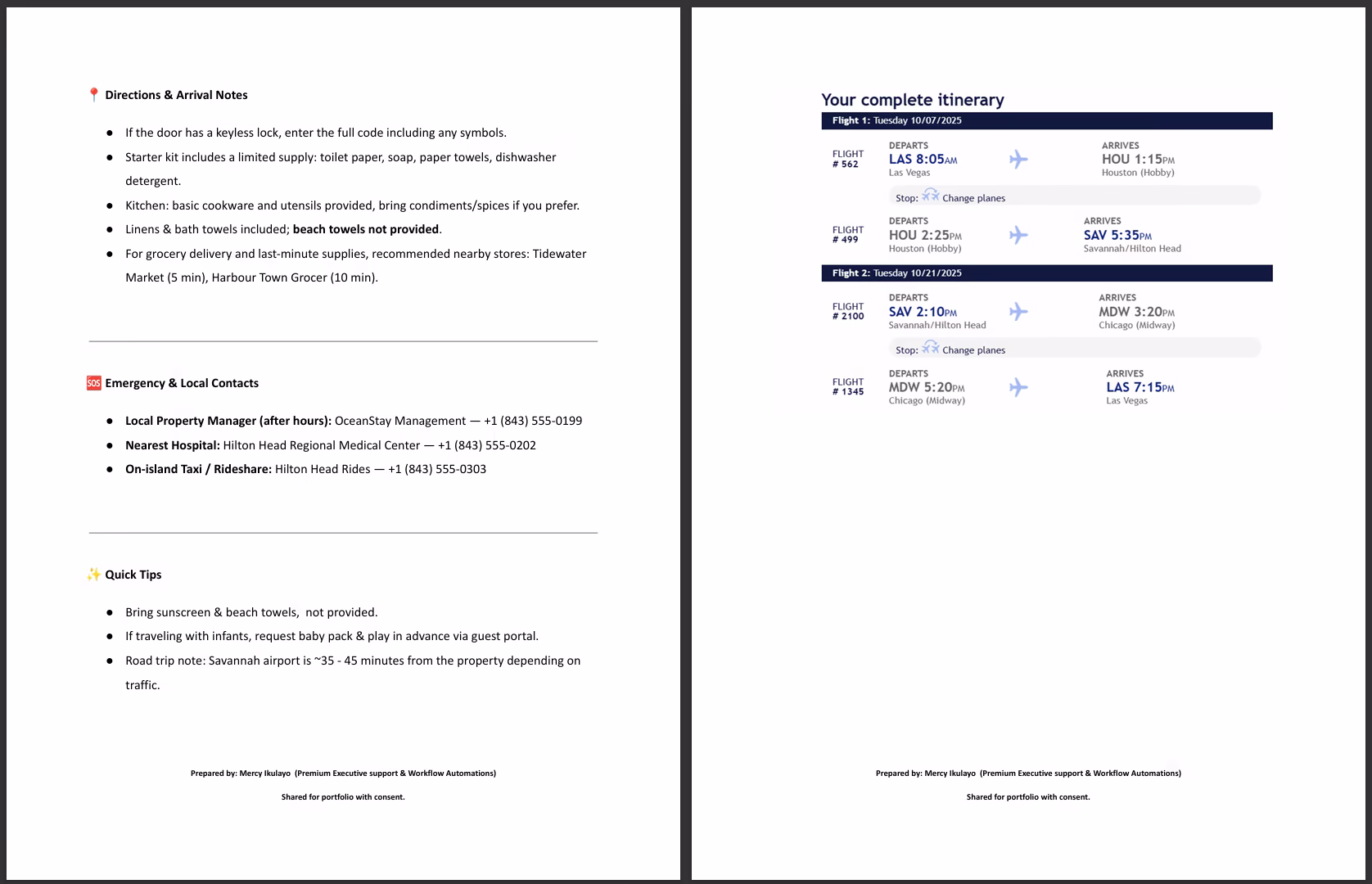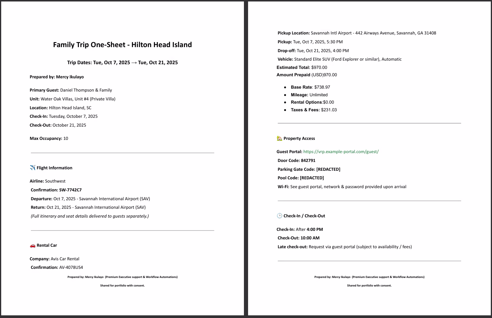 I organized a stress-free family getaway for a busy executive family traveling to Hilton Head Island. Every detail: flights, rental car, villa access, and check-in instructions was documented in one easy-to-read page, so they could simply relax and enjoy the trip.