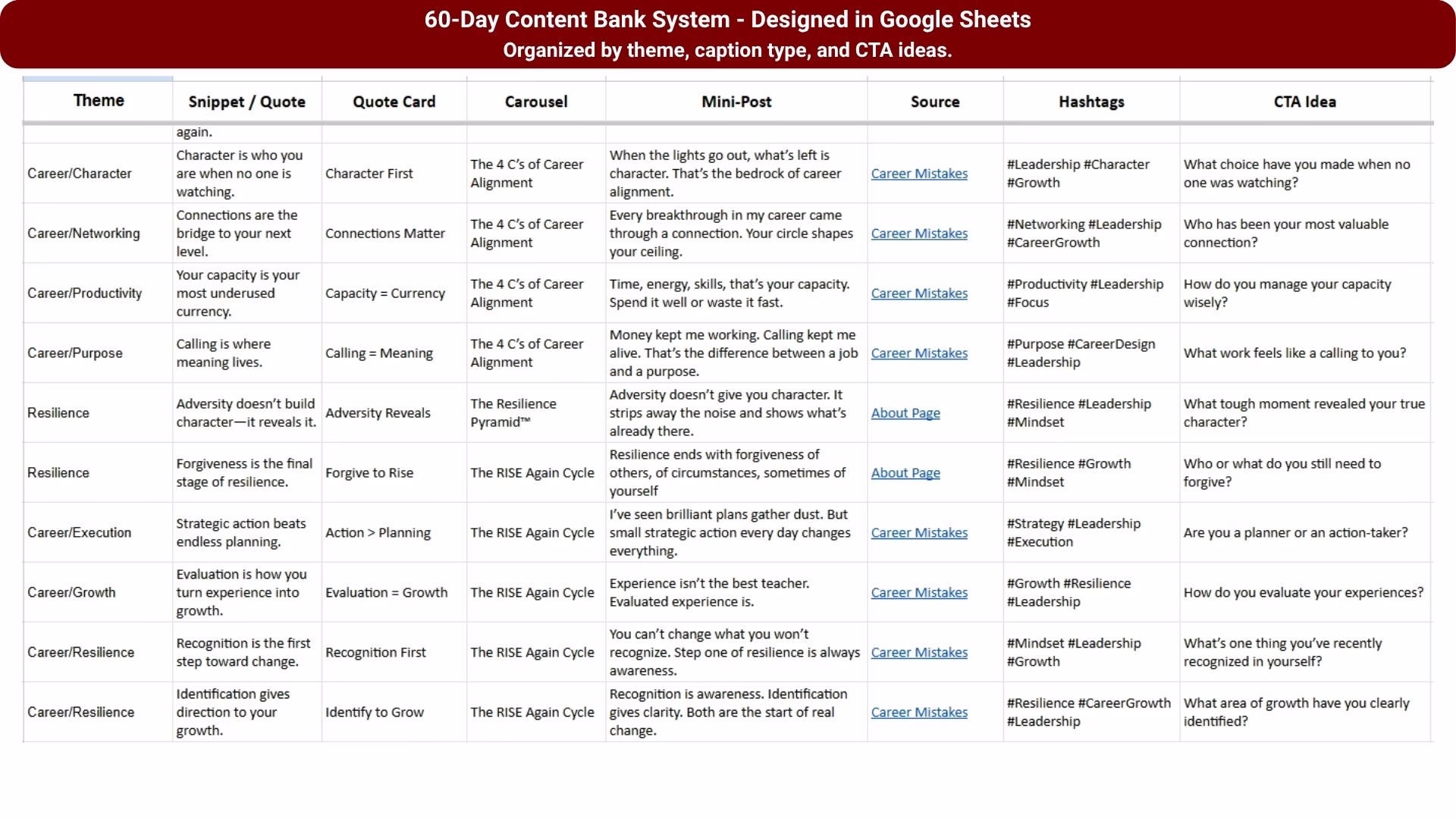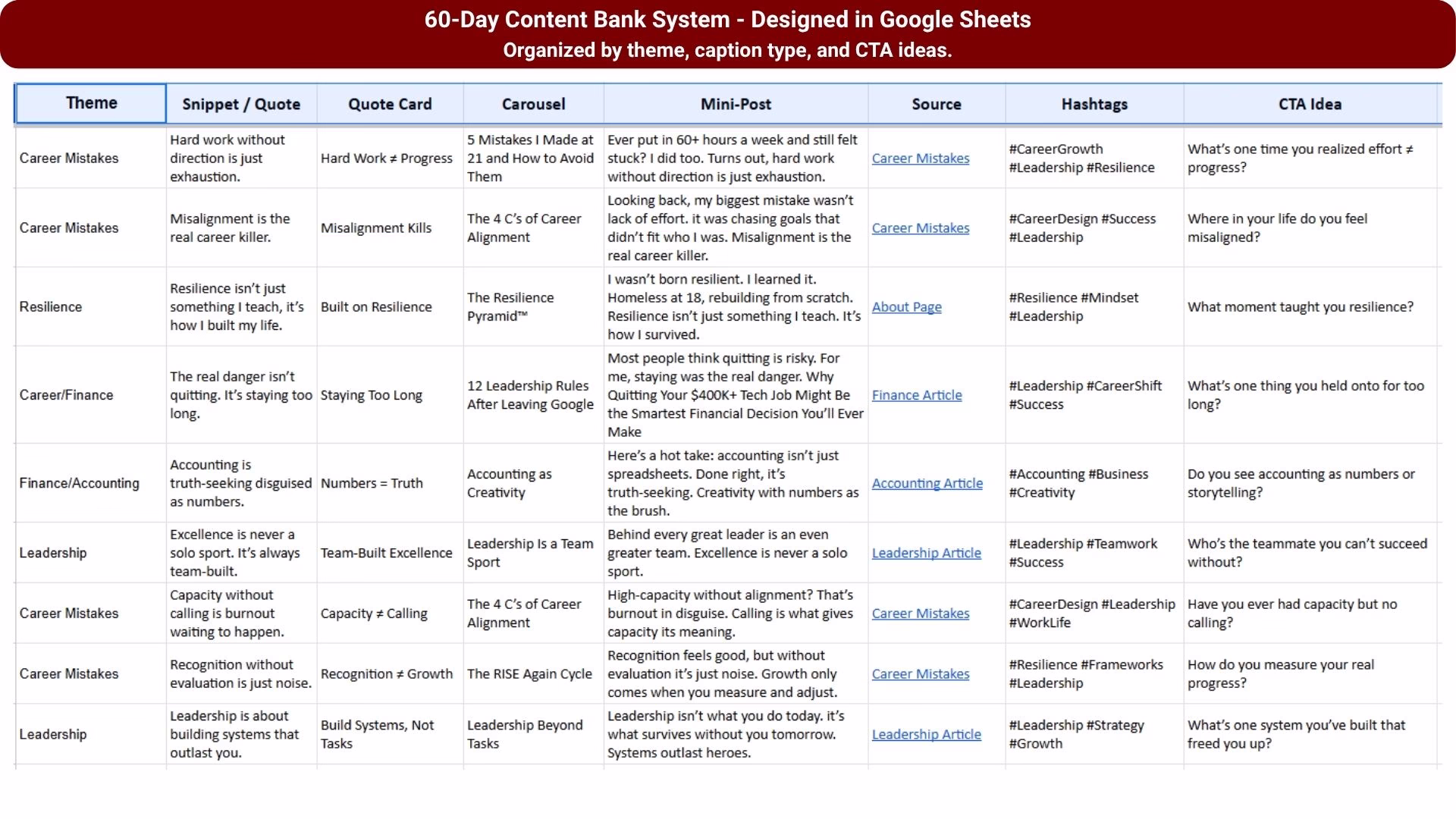 60-Day Content   Bank Built a full content planning system for LinkedIn and blog posts. Organized by themes, visuals, and captions in google sheet. Simplified content workflow and reduced creative block.